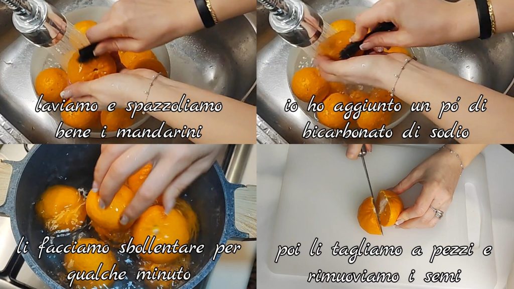 Allereerst moeten we de mandarijnen grondig wassen door wat bicarbonaat toe te voegen en de schil goed te borstelen met een borstel of een ruwe spons. We laten ze ongeveer twintig minuten koken in schoon water, daarna gieten we ze af en laten we ze afkoelen. We snijden ze in stukken en verwijderen eventueel de zaden.
