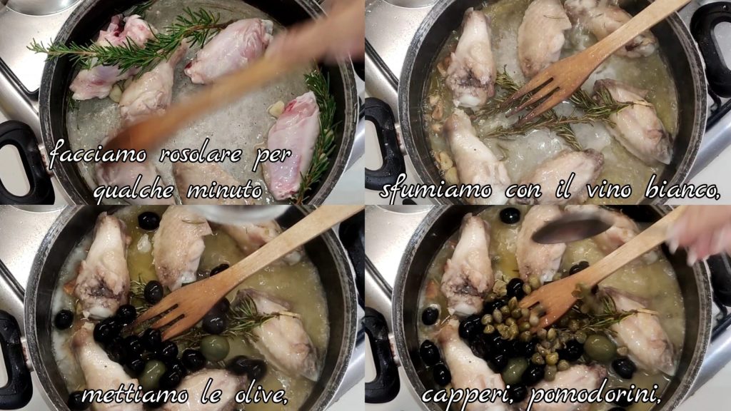 Laat het een paar minuten bruin worden. Blus af met witte wijn. Voeg de olijven, kappertjes en cherrytomaatjes toe.