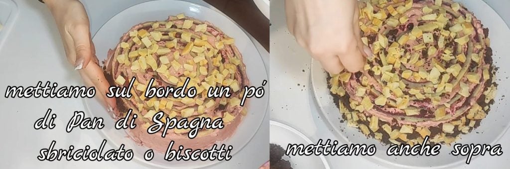 Bedek de rand met wat biscuit of verkruimelde koekjes en decoreer naar wens.