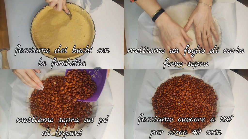 Prik gaatjes met een vork. Bedek met bakpapier en leg er peulvruchten bovenop. Bak op 180° voor ongeveer 40 min.