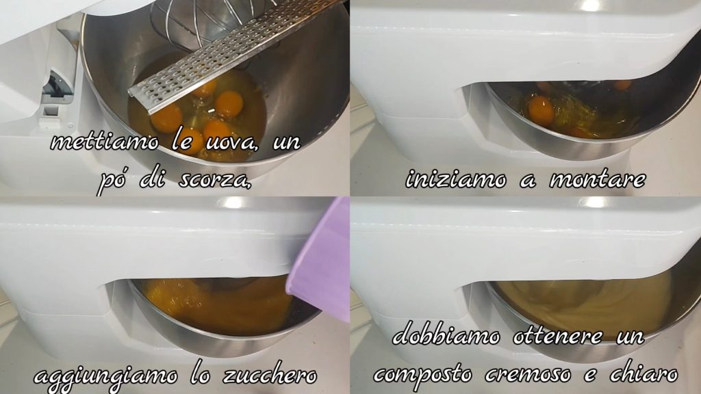 We voegen de eieren en wat citroenschil toe en beginnen te kloppen. We voegen de suiker toe en kloppen tot we een lichte, romige massa krijgen.