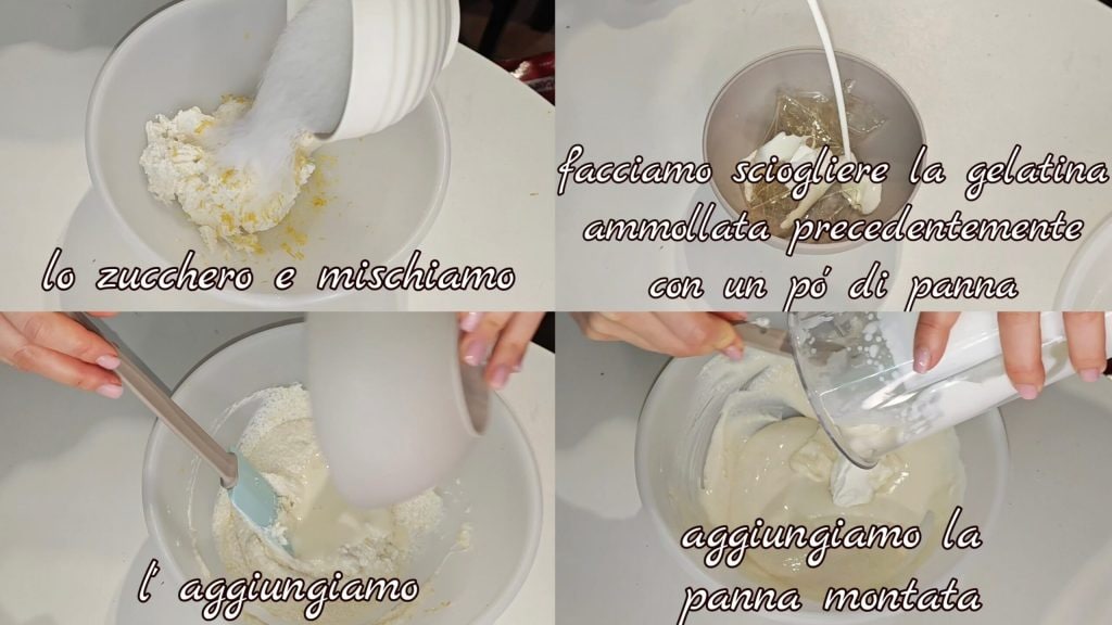 In een kom plaatsen we de ricotta, citroenaroma, citroenschil, de suiker en mengen. We smelten de eerder geweekte gelatine met een beetje kokende room en voegen het toe. We mengen goed. We voegen de slagroom toe.