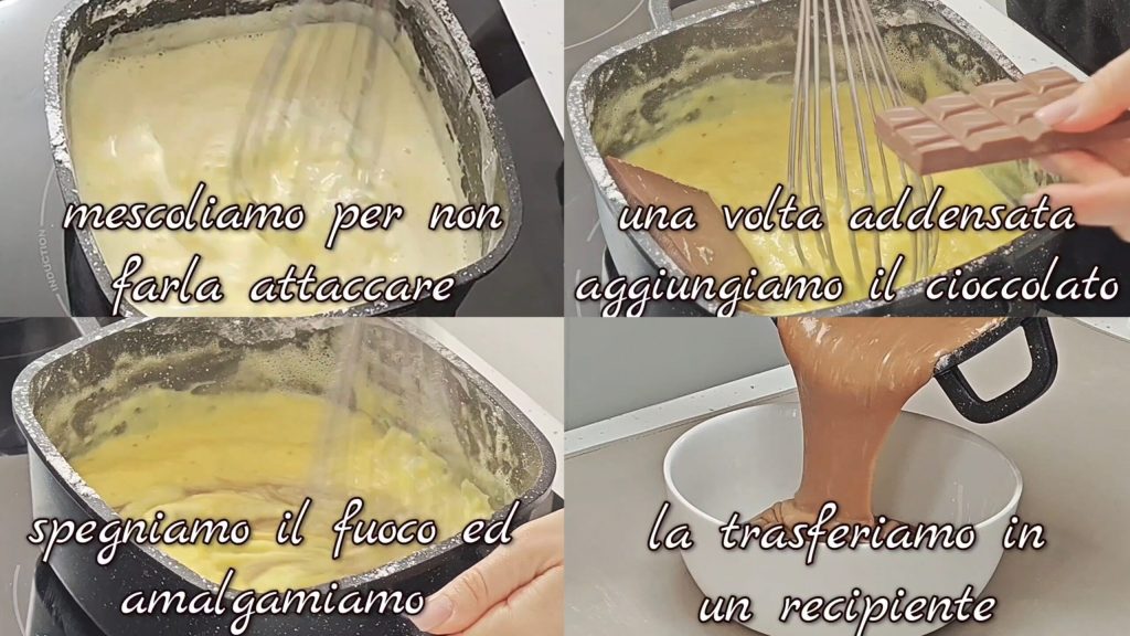 roer om te voorkomen dat het aanbrandt. Zodra het is ingedikt, zetten we het vuur uit en voegen de chocolade toe, dan mengen we. We doen het in een kom,
