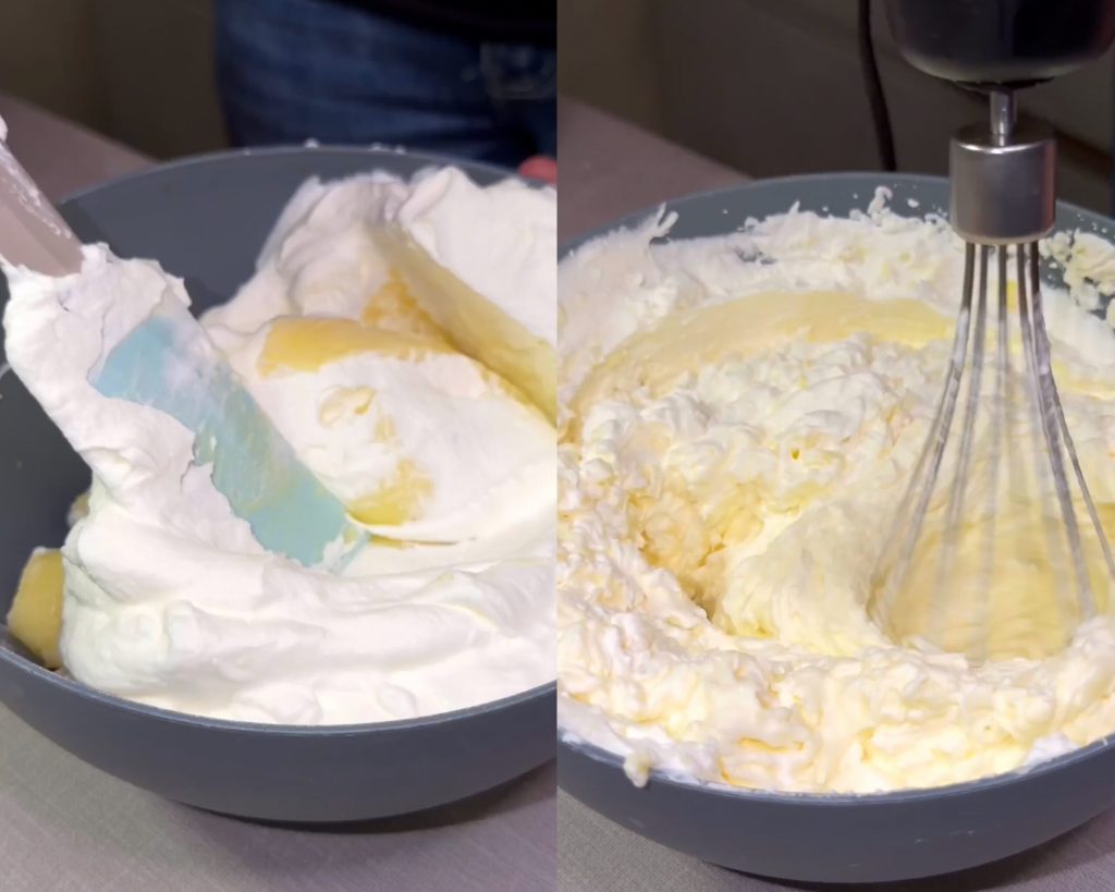Als de crème goed afgekoeld is, spatel je voorzichtig de opgeklopte slagroom erdoor om een zachte en lichte chantilly te krijgen.