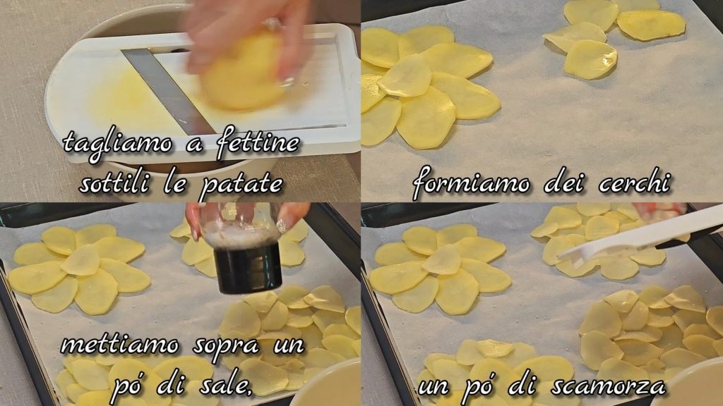 Eerst schillen en wassen we de aardappelen, daarna snijden we ze met een mandoline in heel dunne plakjes. Op een bakplaat bekleed met bakpapier vormen we cirkels met de verkregen aardappelschijfjes. Laat wat ruimte tussen hen. Strooi er een beetje zout en geraspte scamorza overheen.