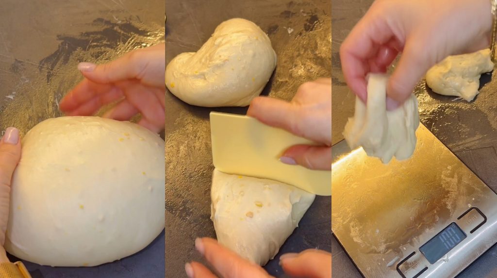 Ik vorm een bol en verdeel het deeg in stukken van ongeveer 100 g elk.