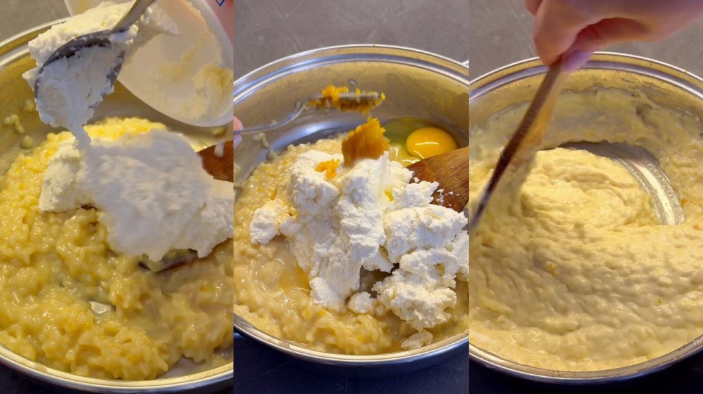 Wanneer de rijst koud is voeg ik de ricotta en het ei toe.