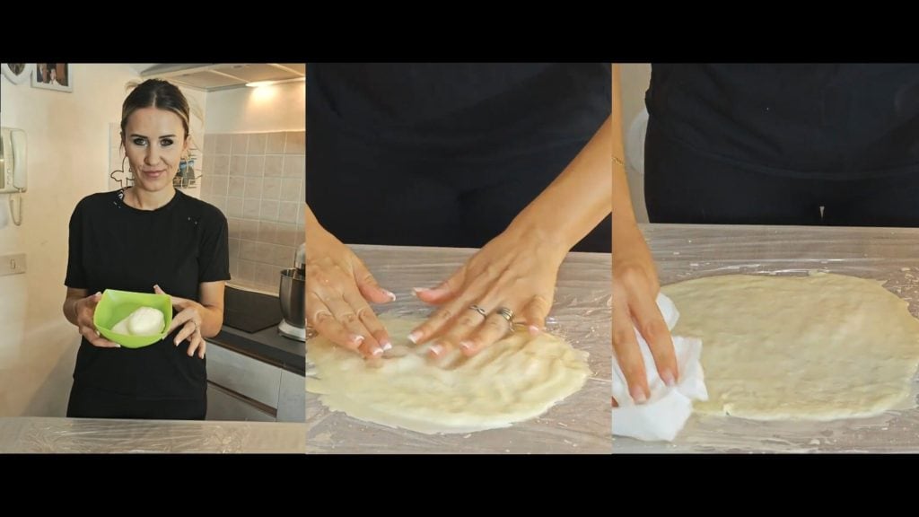 Verwarm de mozzarella lichtjes (magnetron of au bain-marie) om het zachter te maken. Verspreid de mozzarella gelijkmatig op folie, zodat er een grote “plak” ontstaat die groot genoeg is om op te rollen. Dep met keukenpapier om overtollig vocht te verwijderen.