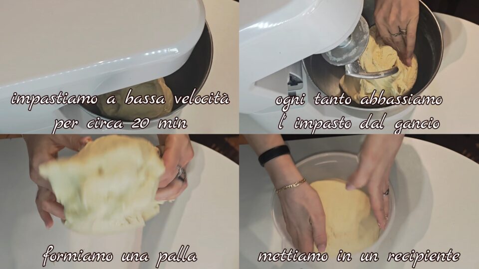 De volgende dag nemen we het deeg en doen we het weer in de keukenmachine. Voeg de gist, de bloem toe en begin te kneden, voeg het water beetje bij beetje toe.