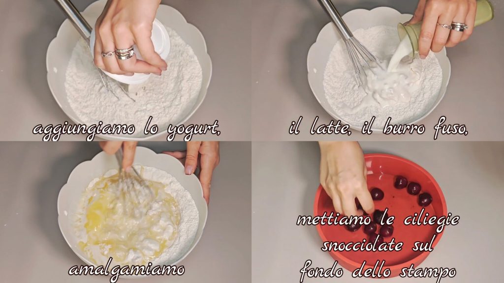 We voegen de yoghurt, melk, gesmolten boter toe en mengen. Ondertussen wassen en reinigen we de kersen en verwijderen we de pitten en leggen we ze op de bodem van de vorm (ik heb een siliconen vorm gebruikt, dus ik heb deze niet bebloemd).