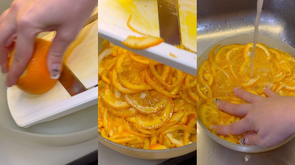We wassen de sinaasappels heel goed, snijden ze vervolgens in heel dunne plakjes, bij voorkeur met een mandoline. We leggen de plakjes in een kom en bedekken ze met water
