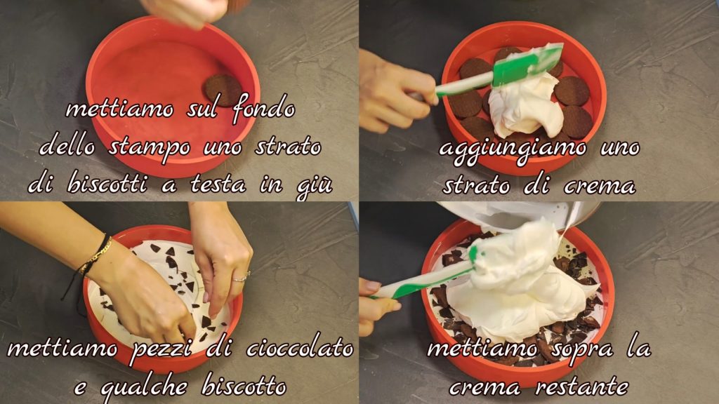 • We leggen op de bodem van de vorm een laag koekjes met de bovenkant naar beneden. (Ik raad aan om een siliconenvorm te gebruiken, anders de vorm met plasticfolie bekleden voor eenvoudigere extractie van de taart). Voeg een laag crème toe (ongeveer de helft), leg er stukjes chocolade en enkele verkruimelde koekjes op. Dek af met de resterende crème (ongeveer de helft)