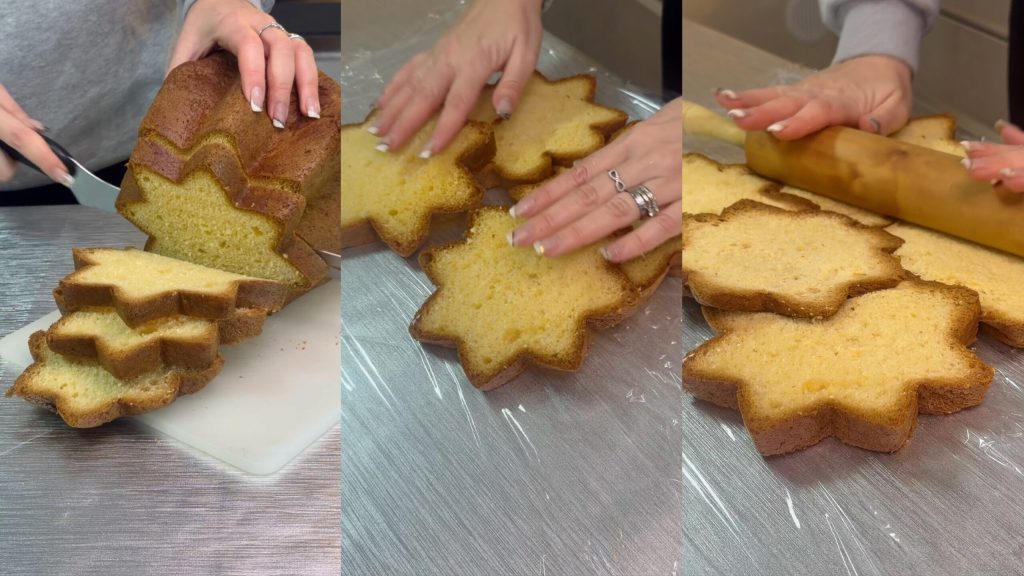 Snijd de pandoro in plakken en leg ze op plasticfolie, licht overlappend. Druk ze voorzichtig plat met een deegroller, zodat je een gelijkmatige basis voor het rolletje creëert.