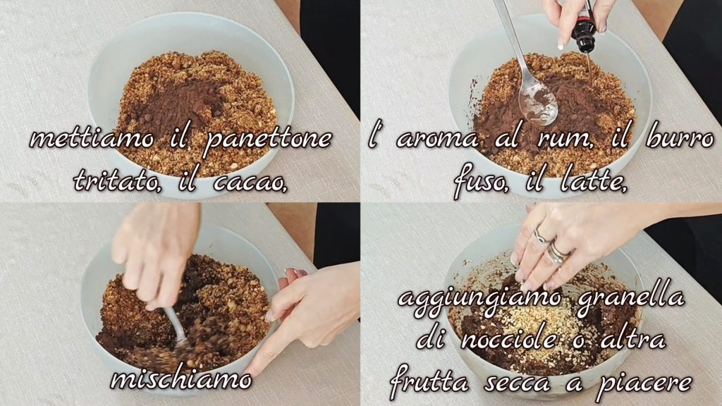 Doe de verkruimelde panettone, cacao, rumaroma, gesmolten boter, melk en meng. Voeg hazelnootgranulaat of ander gedroogd fruit naar smaak toe en meng goed.