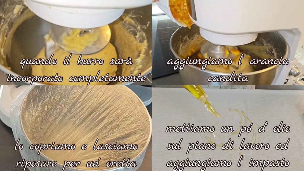 • Zodra het volledig is opgenomen, voeg de gekonfijte sinaasappels toe. Dek af en laat ongeveer een uur rusten, verplaats het dan naar een geoliede werktafel.