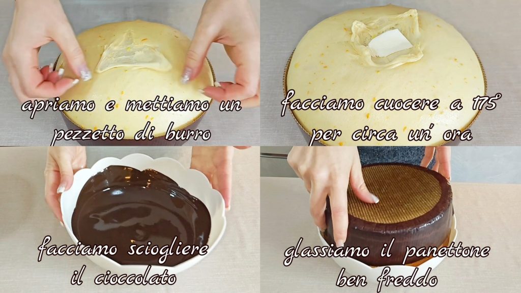 • Open een beetje en plaats een stukje boter. Bak ongeveer een uur op 175° C. Laat de chocolade smelten en glazuur de panettone nadat deze goed is afgekoeld.