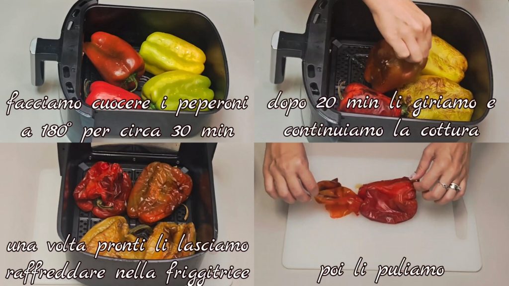 Eerst laten we de paprika’s in de heteluchtfriteuse of in de oven op 180° ongeveer 30 min koken. Na ongeveer 20 min draaien we ze om en blijven we ze koken. Zodra ze klaar zijn, laten we ze afkoelen in de heteluchtfriteuse en maken we ze schoon door ook de zaadjes te verwijderen
