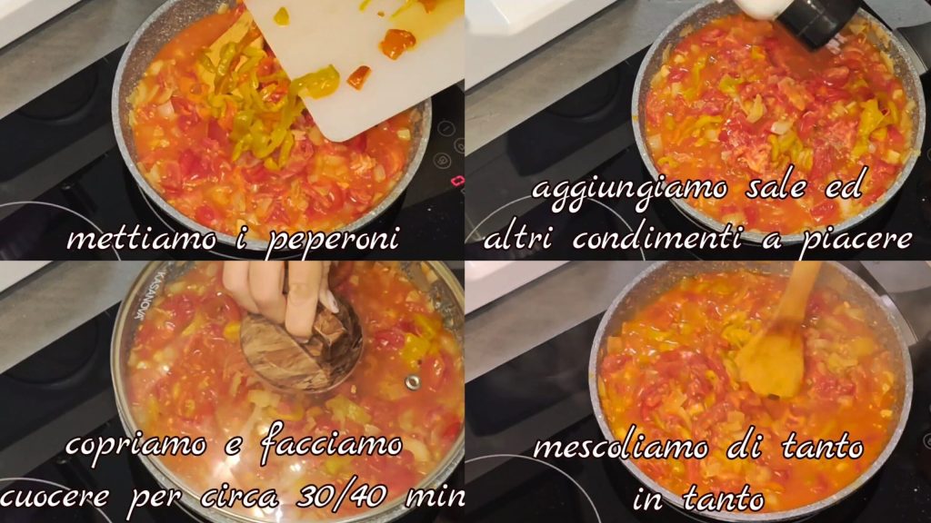 We voegen de paprika’s toe. We voegen zout en kruiden naar smaak toe en laten het ongeveer 30/40 min koken, af en toe roeren.