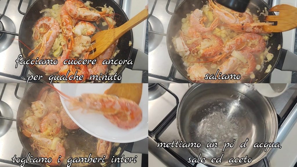 Laat verdampen. Voeg zout toe. Haal de hele garnalen eruit en zet ze apart. Ondertussen breng je in een pan water aan de kook met azijn en een beetje zout.
