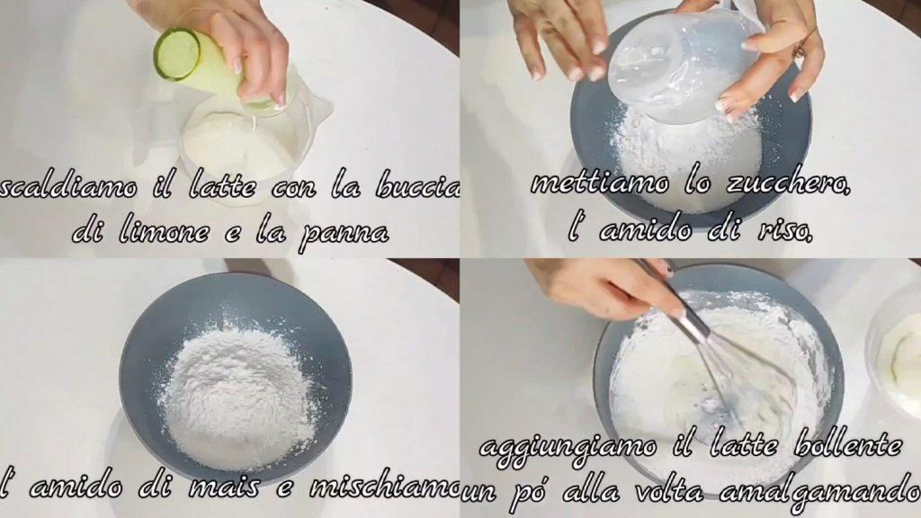 We verwarmen de melk met citroenschil en room. Voeg het rijstzetmeel en maïszetmeel toe en meng. Voeg de melk beetje bij beetje toe terwijl je roert.