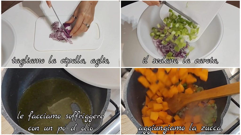 Allereerst maken we de knoflook, ui, bleekselderij en wortel schoon, wassen en snijden we ze. We fruiten ze met een beetje olie. Voeg de schoongemaakte en in stukken gesneden pompoen toe.