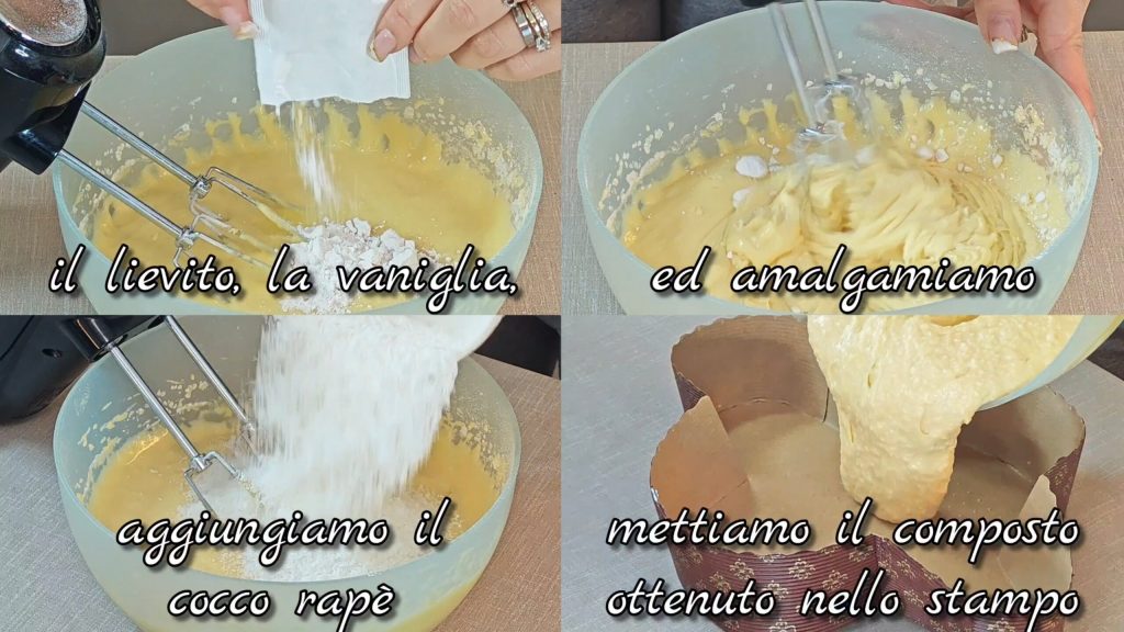 • We voegen het bakpoeder, de vanille toe en mengen. Ten slotte voegen we de geraspte kokos toe en mengen. We gieten het verkregen mengsel in de 750 g duivenvorm