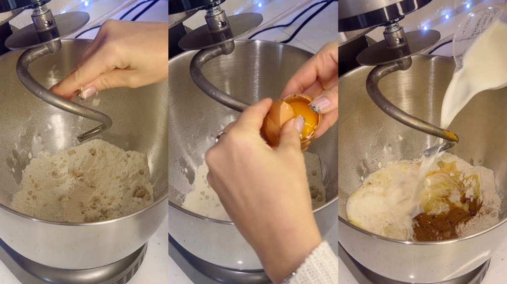 Berei het deeg: Meng in een kom bloem, gist, ei, kaneel, zachte boter en lauwwarme melk.