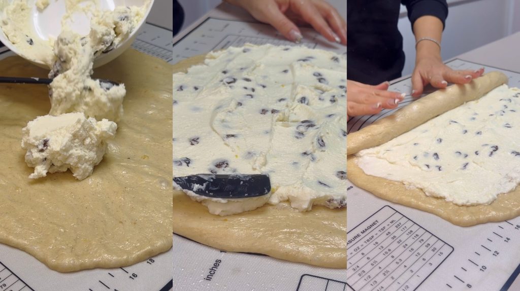 Verdeel de ricotta crème erover, bedek de hele oppervlakte. Rol het deeg op vanaf de lange zijde. Snijd de rol in dikke plakken van ongeveer 3–4 cm.