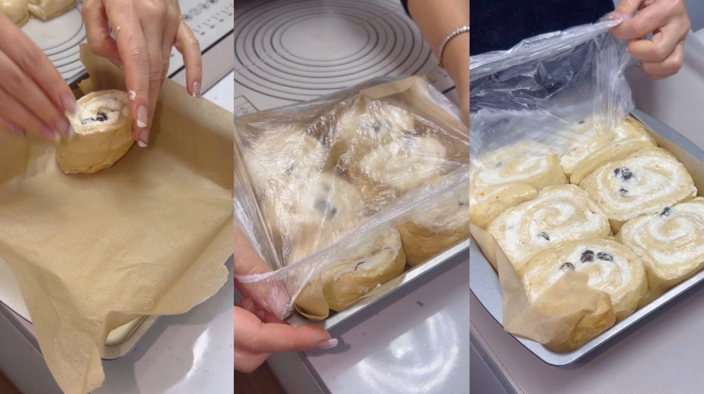 Leg de rolletjes in een bakvorm bekleed met bakpapier, laat een beetje ruimte tussen hen. Dek af en laat opnieuw 1 uur rijzen. Na de tijd, onthul de bakvorm en bak de cinnamon rolls op 180°C gedurende 40-50 minuten, tot ze goudbruin zijn.