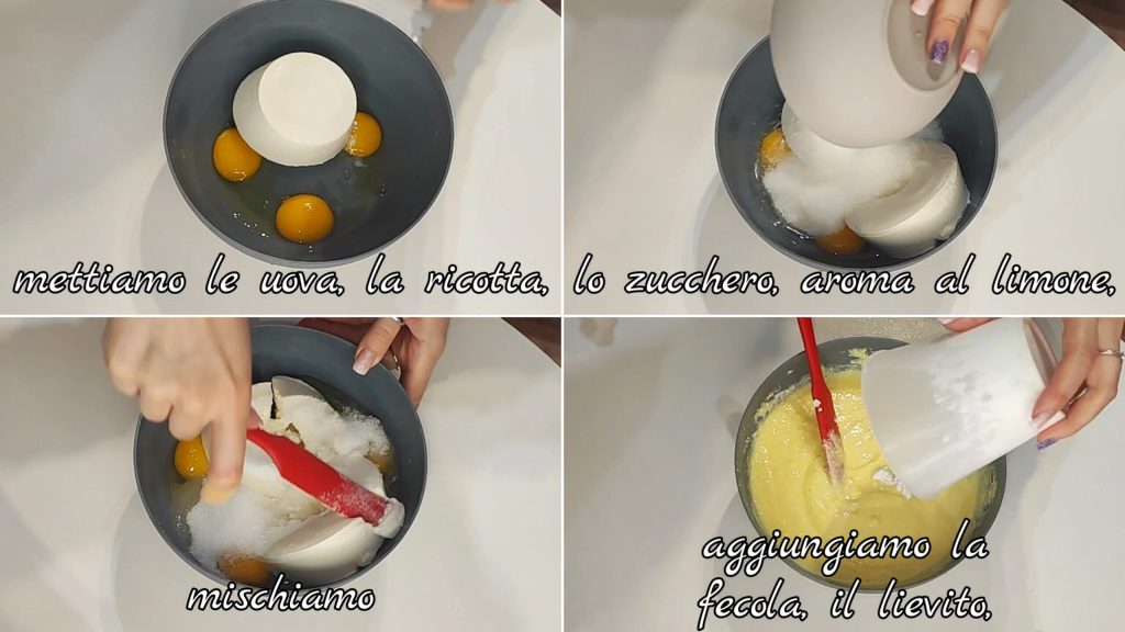 In een kom voegen we de eieren, de ricotta, de suiker, de citroen aroma toe en mengen. Voeg het aardappelzetmeel en het bakpoeder toe.