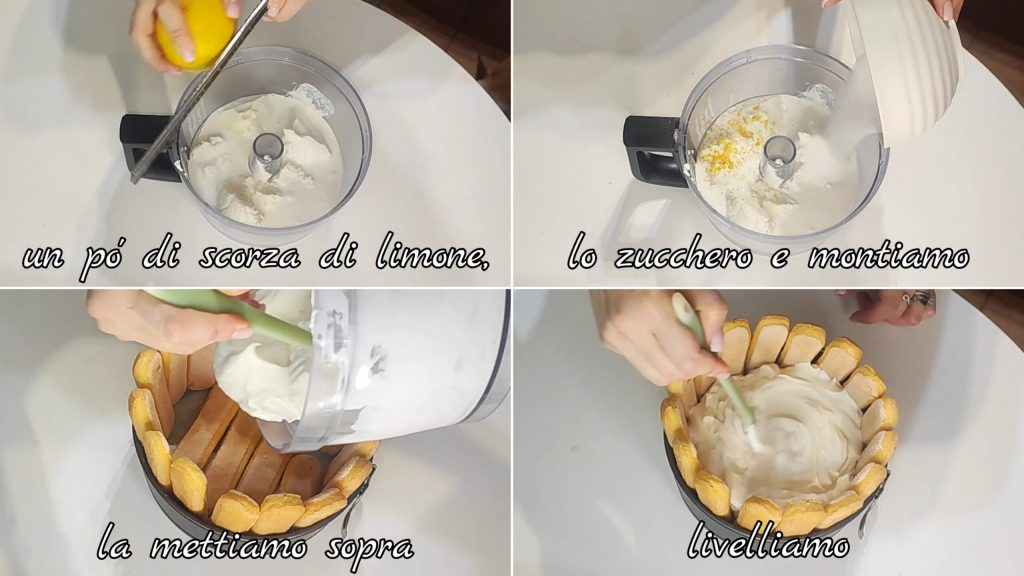 Voeg een beetje citroenschil toe, de suiker en klop het op. Doe de verkregen crème in de vorm met de lange vingers erin. Maak het glad.