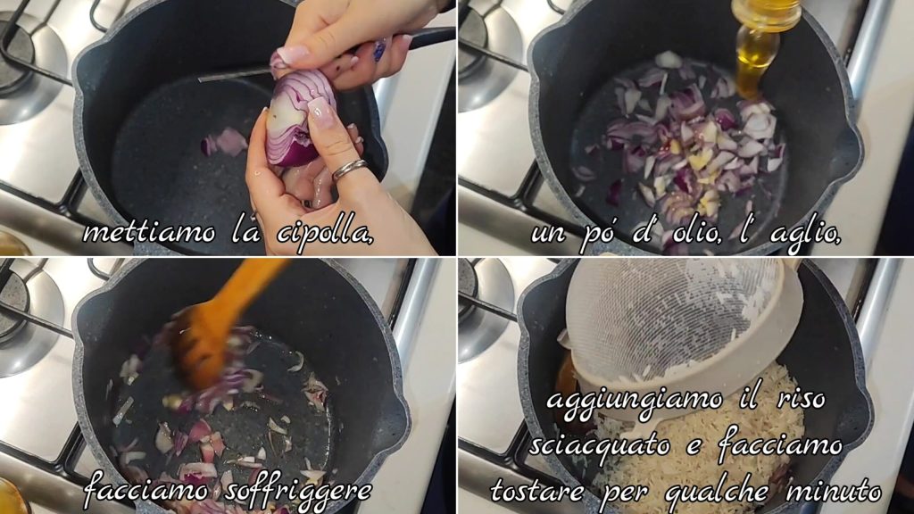 Doe de gesneden ui, een beetje olie, knoflook in een pan en laat fruiten. Voeg de eerder gewassen en goed uitgelekte rijst toe en laat een paar minuten roosteren.