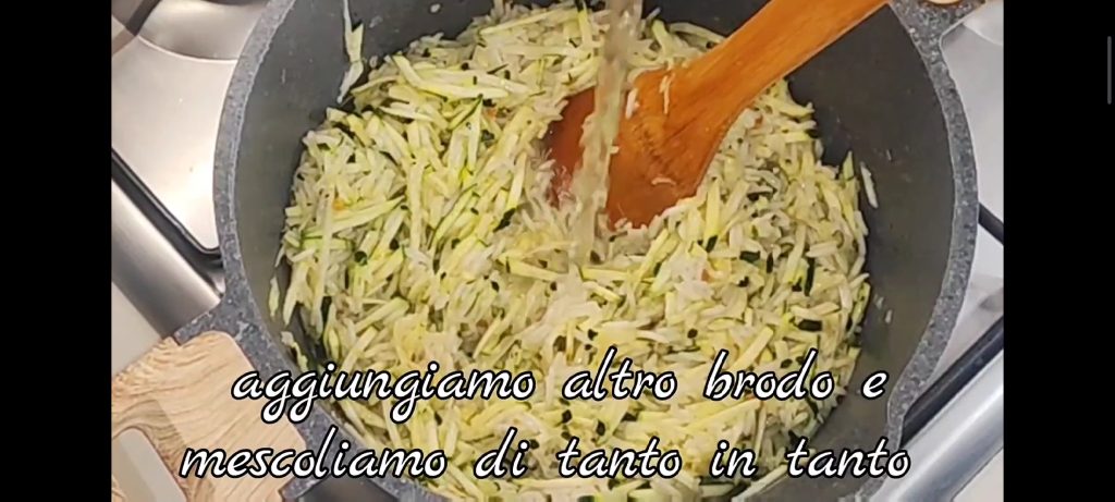 Rooster het enkele minuten. Voeg beetje bij beetje de bouillon toe en laat het koken, af en toe roeren. Voeg halverwege de geraspte courgette toe.