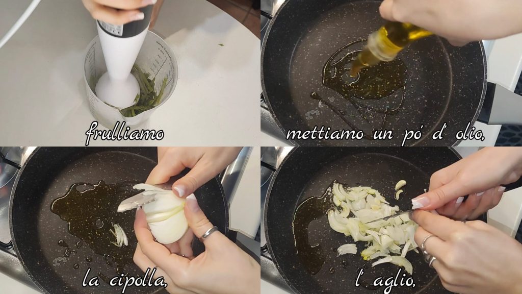 pureer ze met een staafmixer. In een pan doen we wat olie, de gesneden ui, de knoflook.