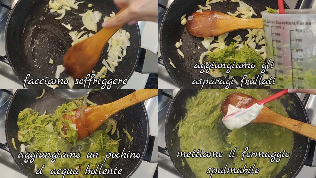 laat fruiten. Voeg de gepureerde asperges toe, een beetje kokend water en de smeerkaas.