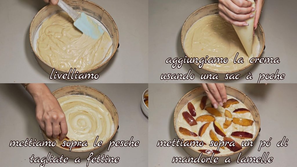 Maak glad met een spatel en leg de banketbakkersroom erop met behulp van een spuitzak. Ik heb ervoor gekozen om cirkels te maken, maar je kunt ook strepen, toefjes, etc. maken. Plaats het zoals je het leuk vindt. Bovenop de room leggen we de in plakjes gesneden perziken. Voeg een beetje geschaafde amandelen toe