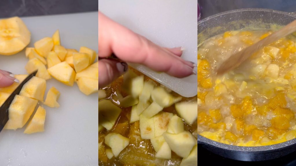 In de tussentijd schillen we de appel en snijden deze in stukjes. Na de rusttijd voegen we de appel toe aan de citrusvruchten en verplaatsen we alles naar een pan. Breng aan de kook en laat op middelhoog vuur ongeveer 1 uur koken, af en toe roeren.