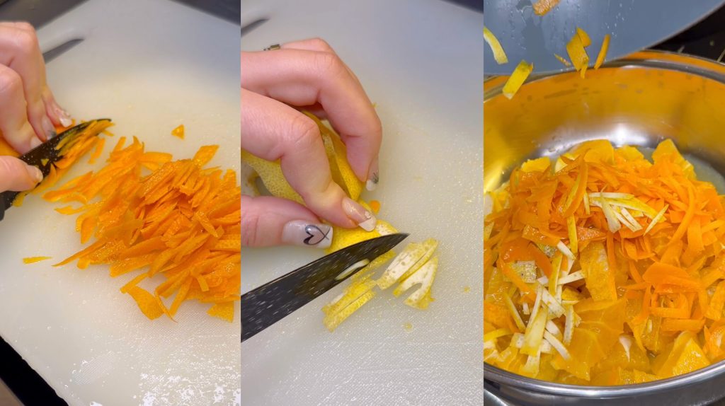 • Met een dunschiller verwijderen we een zeer dunne schil van enkele sinaasappels en bewaren deze apart. We maken vervolgens de sinaasappels schoon door het witte deel, de draden en alle zaden volledig te verwijderen, waardoor alleen de pulp overblijft. Snijd de pulp in stukken. Snijd de sinaasappelschil in dunne reepjes of hak ze fijn, afhankelijk van de gewenste structuur. Doe hetzelfde met de schil van een citroen en voeg alles toe aan een pan.