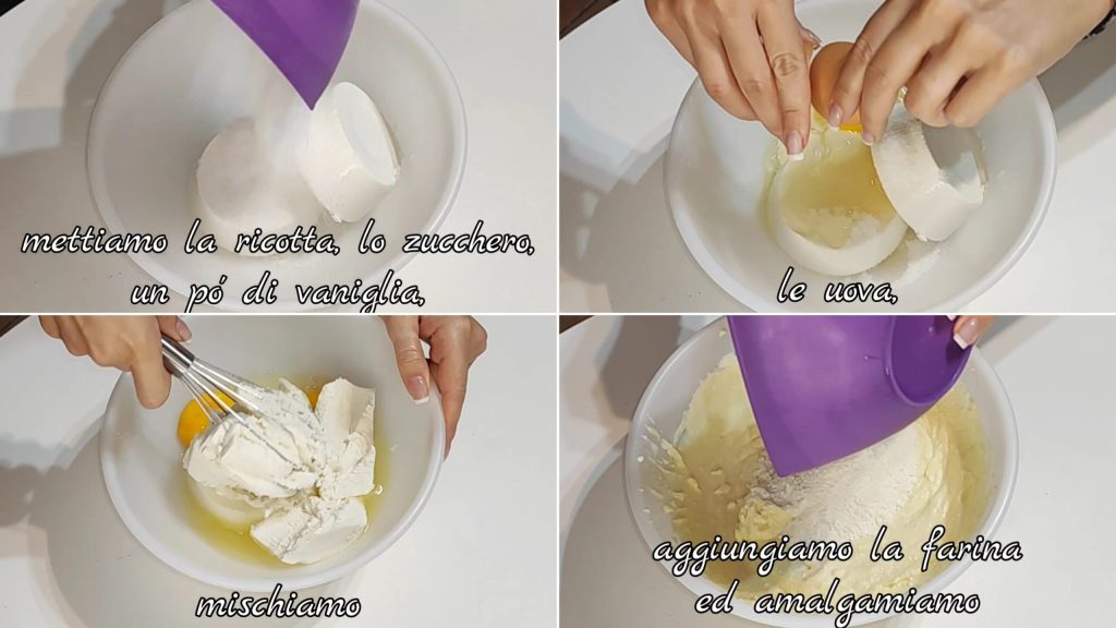 Doe de ricotta, eieren, suiker, een beetje vanille in een kom en meng goed om alle ingrediënten te verenigen. Voeg de bloem toe en meng.