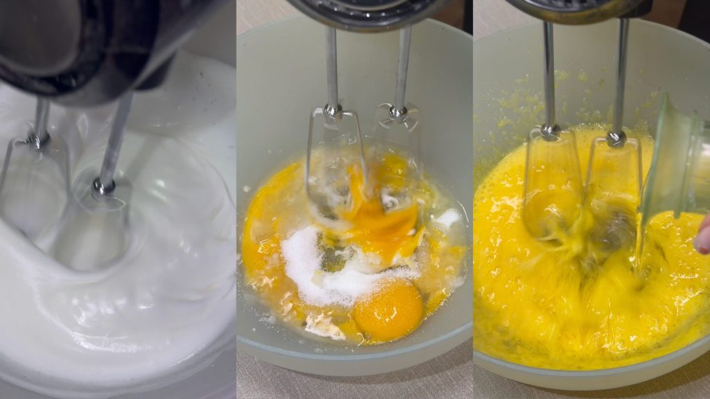 • Voeg de geklopte eiwitten in drie delen toe, met voorzichtige bewegingen van onder naar boven, om het mengsel niet te laten inzakken.