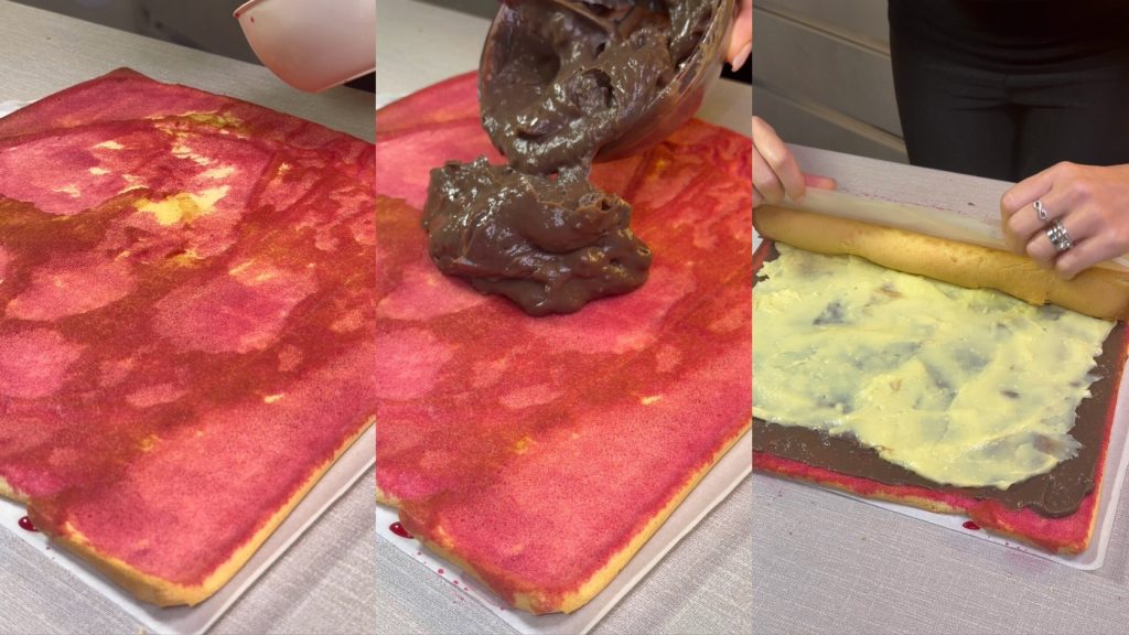 Gebruik het bakpapier om de basis vanaf de kortste kant op te rollen, lichtjes knijpend maar zonder het dessert te breken. Wikkel de rol in bakpapier en laat het in de koelkast rusten voor minstens 4 uur (het liefst de hele nacht).