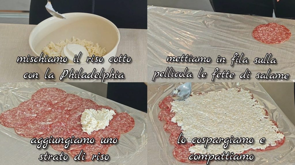 • Allereerst moeten we de rijst koken, dan afgieten en goed laten afkoelen, vervolgens mengen we het met de smeerkaas (zoals Philadelphia). Leg de plakjes salami op een rij op de folie. Voeg een laag rijst toe, strooi en druk goed aan, rol dan zo strak mogelijk op.