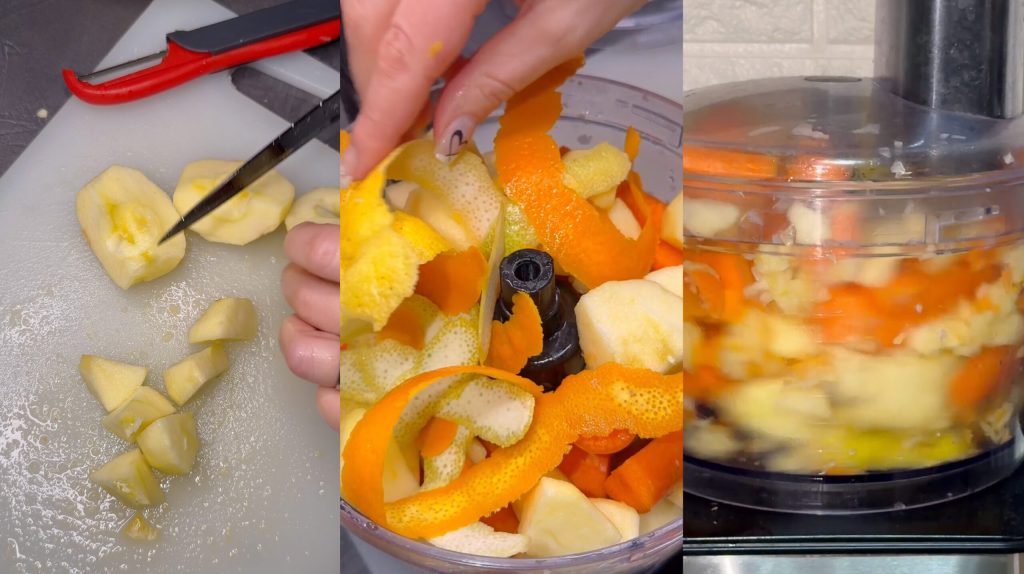 Ondertussen schillen we de appels en wortelen en hakken ze samen met de schil van de citrusvruchten.