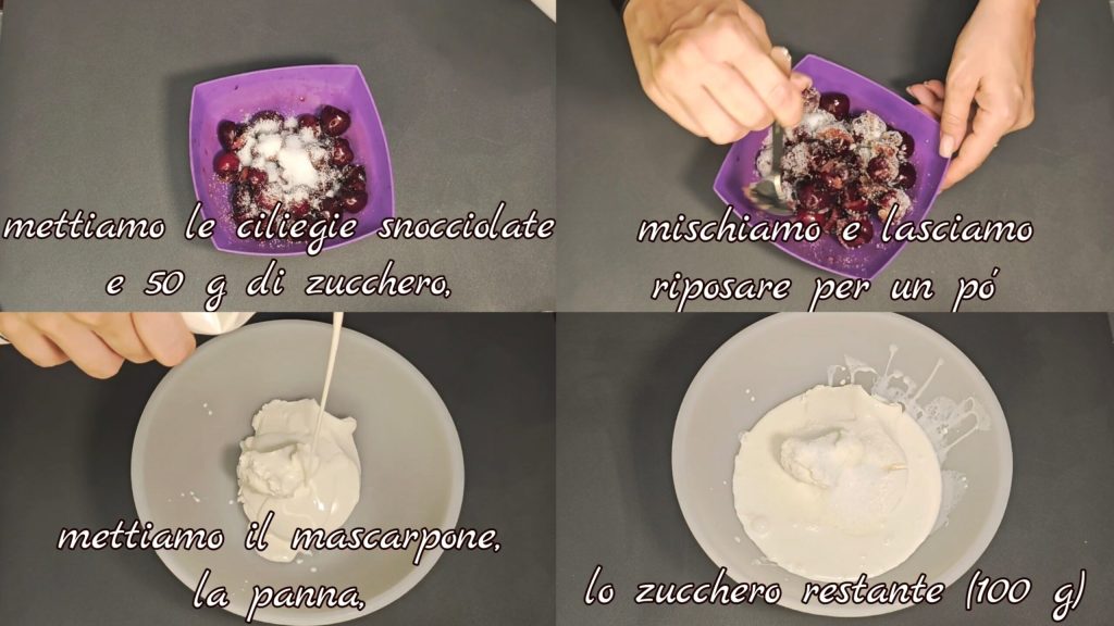 Allereerst moeten we de kersen wassen en ontpitten. Voeg 50 g suiker toe en meng. Laat even staan zodat de siroop vrijkomt. Doe de mascarpone, de room en de overgebleven suiker (100 g) in een kom
