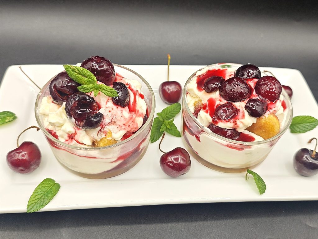 Voeg een laagje room en een paar kersen toe in elk glas. Doe nog twee stukjes geweekte lange vingers in elk glas en vervolgens nog een laagje room.