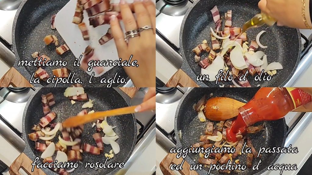 • In een pan doen we het spek, de ui, de knoflook, een scheutje olie en laten we het bruin worden. We voegen de tomatensaus en een beetje water toe.