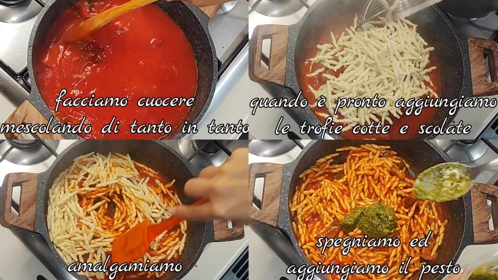 • We laten het koken terwijl we af en toe roeren. Als de saus klaar is, voegen we de gekookte en uitgelekte trofie toe (of een ander soort pasta naar keuze) en mengen we alles. We zetten het vuur uit en voegen de pesto toe (als je het recept voor mijn pesto alla genovese wilt zien, klik dan HIER, anders kun je het kant-en-klaar kopen in elke supermarkt).