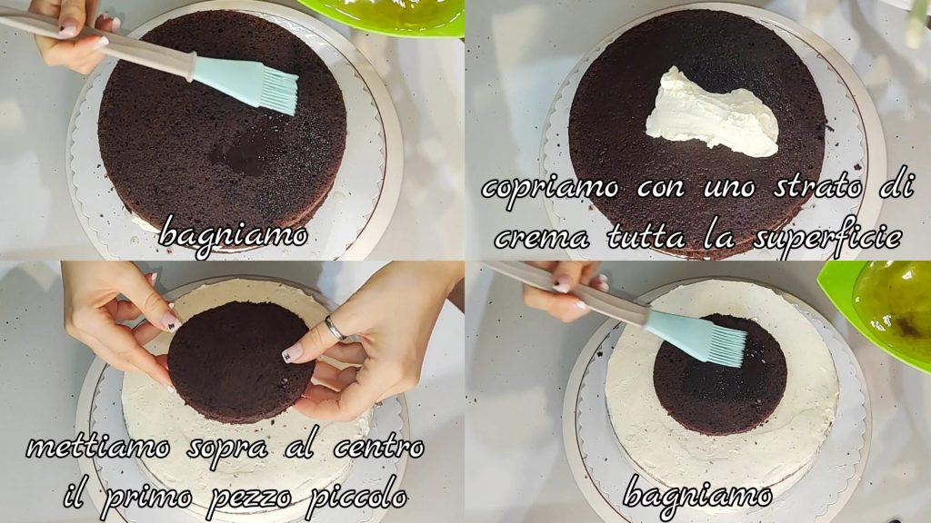 We plaatsen de eerste schijf van 20, we bevochtigen het met water, suiker en aroma’s naar keuze (ik raad een beetje rum aan). We voegen een laag room toe, de tweede schijf van 20.