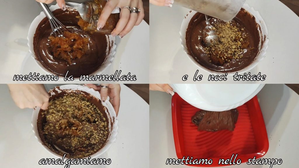 • Tenslotte voegen we de jam en gehakte noten toe. Doe het verkregen mengsel in de vorm,