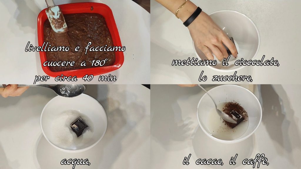 In een kom doen we de chocolade, suiker, water, cacao, koffie,